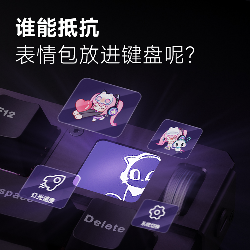 键盘集成一块可自定义显示屏与多功能滚轮,用户可通过屏幕实时查看键盘状态、系统信息或自定义动画,配合驱动设置,滚轮也可轻松设置自定义功能,如音量、灯光效果、组合键等。软硬件结合的高度可自定义性,让每个玩家都能打造属于自己的专属操控界面。
