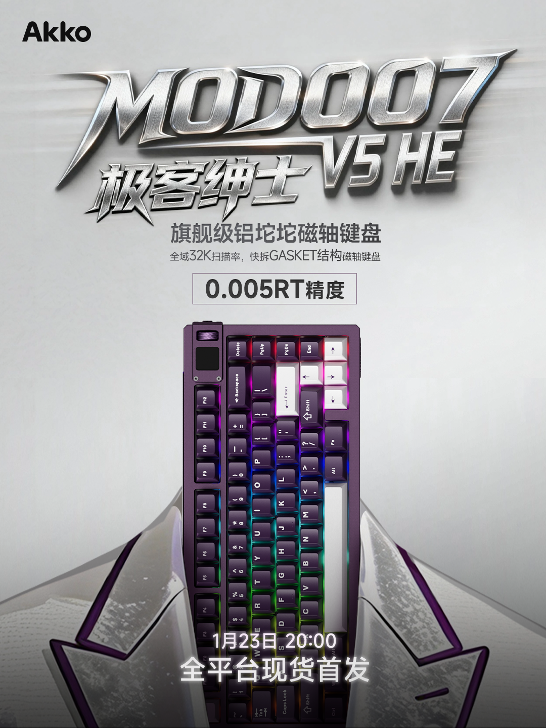 以绅士的礼序,驾驭极客的锋芒。每一次敲击,都是理性与狂热的和鸣。Akko MOD007 V5 HE磁轴键盘将于2026年1月23日20:00重磅首发!作为一款面向高端玩家与键盘发烧友的力作,该键盘不仅在结构上实现全面升级,更在个性化与实用性方面带来全新可能,打造磁轴键盘手感新趋势。