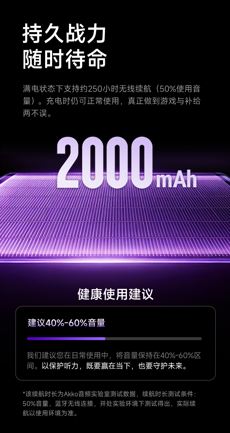 ,在2.4G无线模式下可提供长达约250小时的超长续航,并支持边充边用,彻底告别电量焦虑。