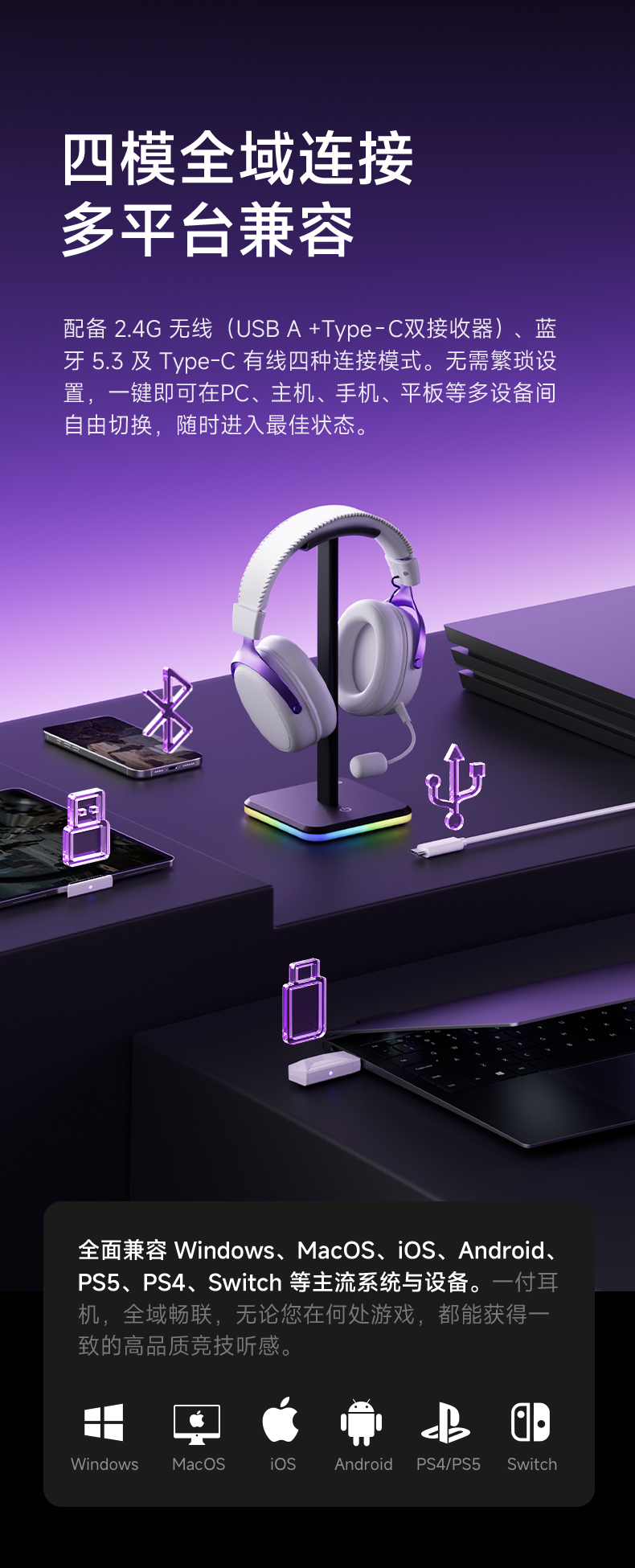 ,确保音画同步,操作跟手。全面兼容Windows、macOS、iOS、Android以及PS5、Switch等主流平台,真正做到“一机全能,全域畅联”。